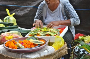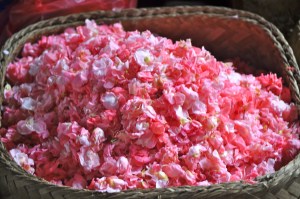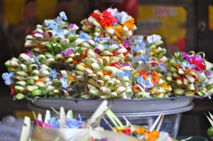 Baskets of flower petals and various other ingredients were piled up ready for assembly into the tiny baskets that are left on shrines, temples and footpaths.