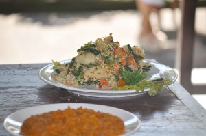 Sayur Urab- a flavourful salad made from long green beans, cabbage, carrots, grated coconut (check out the photo of me grating), lime, chillis and more shallots.