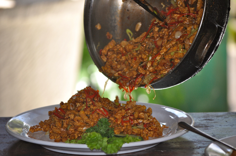 Tempe Manis- a spicy vegetarian dish using deep fried tempeh, or fermented soy bean paste. Tempe is similar to tofu, in that it takes on the flavour of whatever it is cooked with. Same, same…but different.