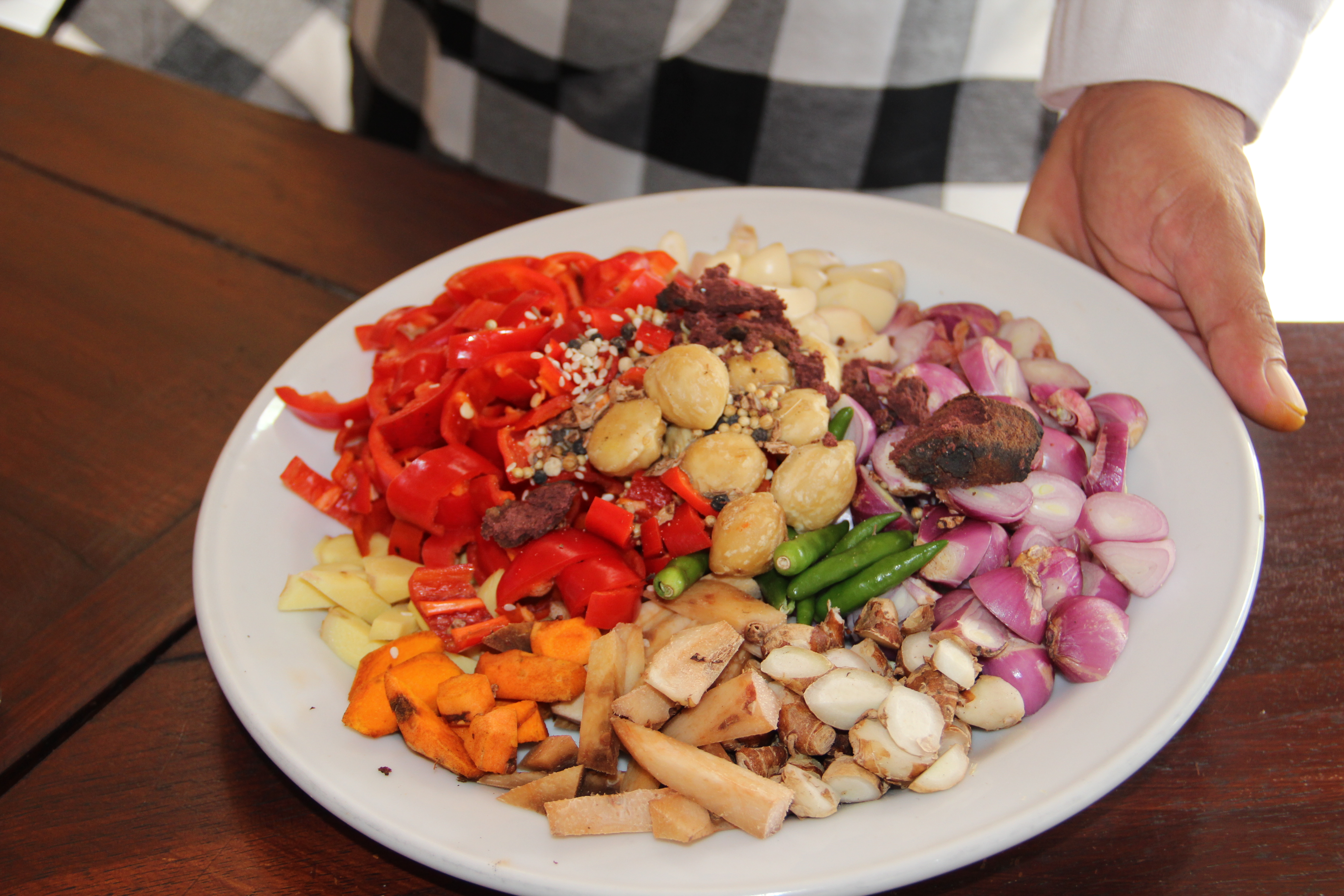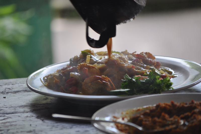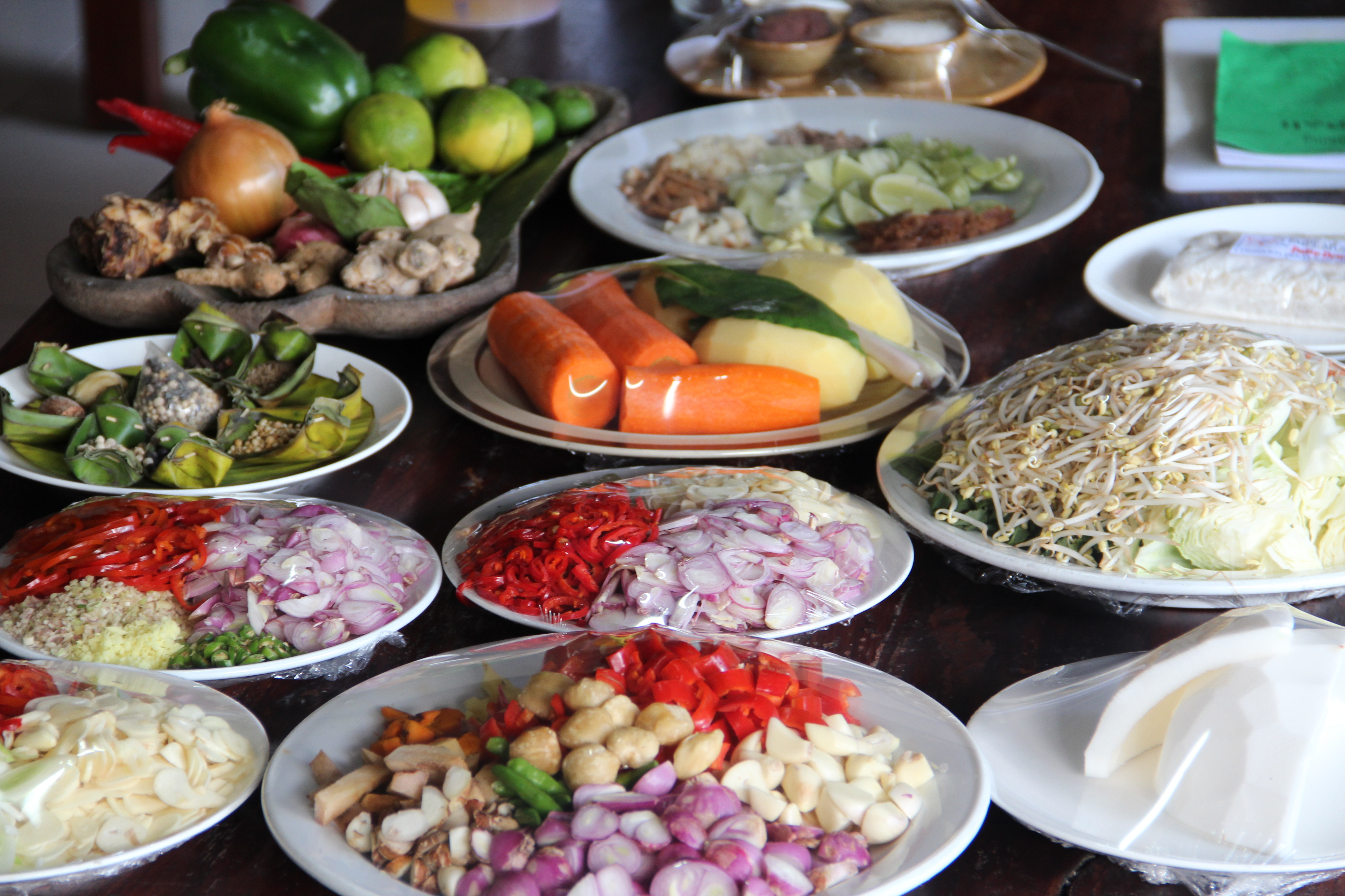 Most Balinese foods build from a flavour base called Bumbu Bali. This basic spice paste is a flavourful mix of shallots, garlic, chillis, galangal, turmeric, coriander seeds, candlenuts, dried shrimp paste, peppercorns, nutmeg, cloves, cumin, sesame seed and coconut (or vegetable) oil. Phew.