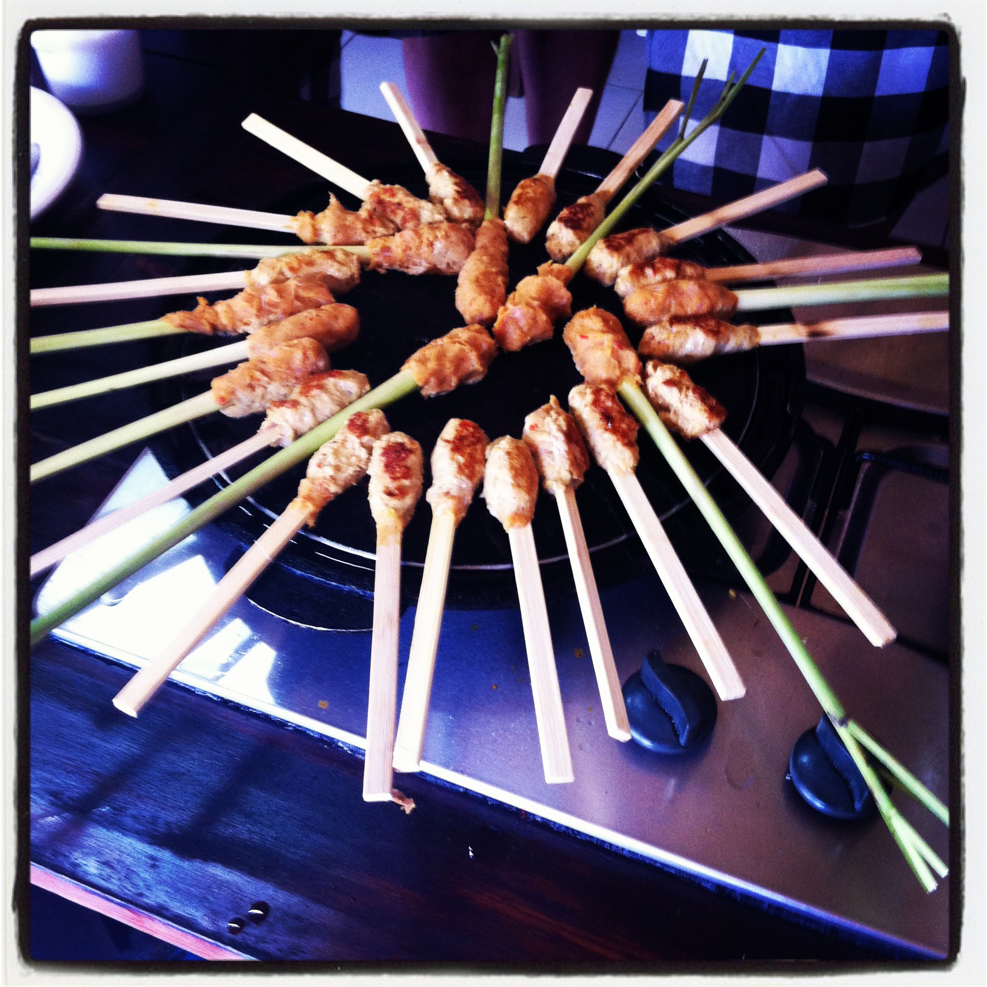 Appearances are, however, very often deceiving. The ball of spiced (in this case) chicken is wound around the stalk…and trust me, it isn’t nearly as easy as it looks!