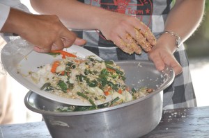 - In a bowl mix together the beans, coconut, shallot/spice mix. Use your hands to get an even mix- as I said, don’t be too precious.