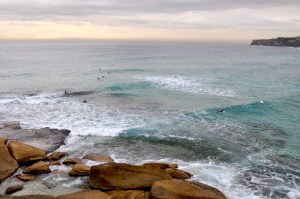 A short, relatively easy, walk brings you to Tamarama (also known as Glamarama) Beach. In the summertime this is a great spot for surfers and sunbathers. Today there were a few persistent guys with boards, but not a lot of activity.