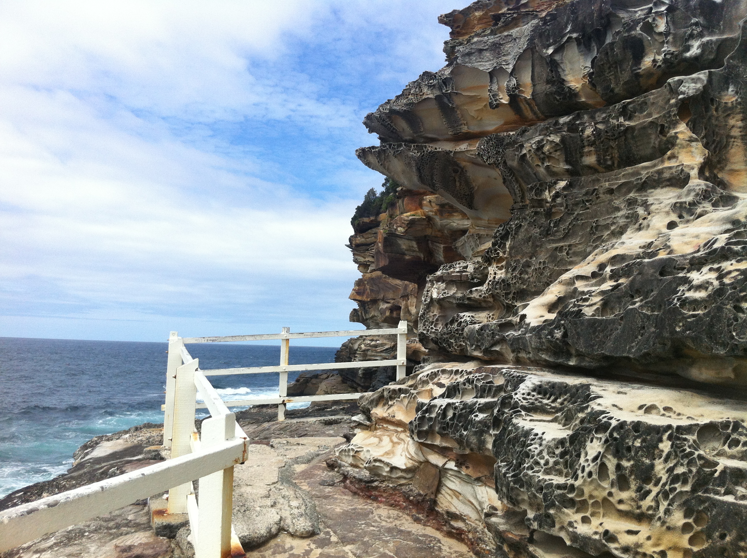 Next is MacKenzie’s Point. The beach here is only accessible at low tide. The rock formations between here and Bondi are amazing. Apparently there are aboriginal rock carvings here, but we didn’t stop to look. I daresay if you were starting the walk at Bondi and had just scaled the steep stairs that we went down, you would have plenty of incentive to stop, catch your breath, and check out carvings!