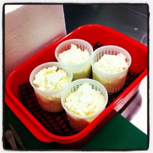 A polysterene box to act as a “cheese cave”, a 10ltr plastic container, a thermometer and a couple of jugs and slotted spoons are about as sophisticated as the equipment gets. The cultures and rennets can all be purchased through the store- in fact everything can be purchased through the workshop. All you need for ricotta, other than milk, is white vinegar. Seriously. As I said, I’m never buying it again.