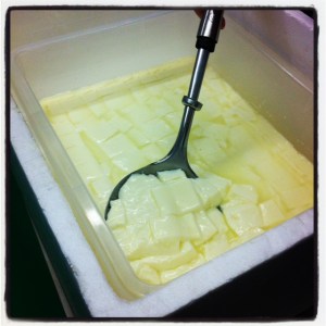 Naturally as we’re doing things with technical terms like “cutting the curd” and “turning the curd” and “cooking the curd” I had visions of myself as a buxom French farm wife somewhere in Provence producing wheels of camembert amongst fresh lavender. Then I switched to being a buxom Italian wife somewhere in Tuscany making cubes of feta and marinating them in olive oil (naturally produced on the farm) scented with rosemary and garlic (also grown on the farm).