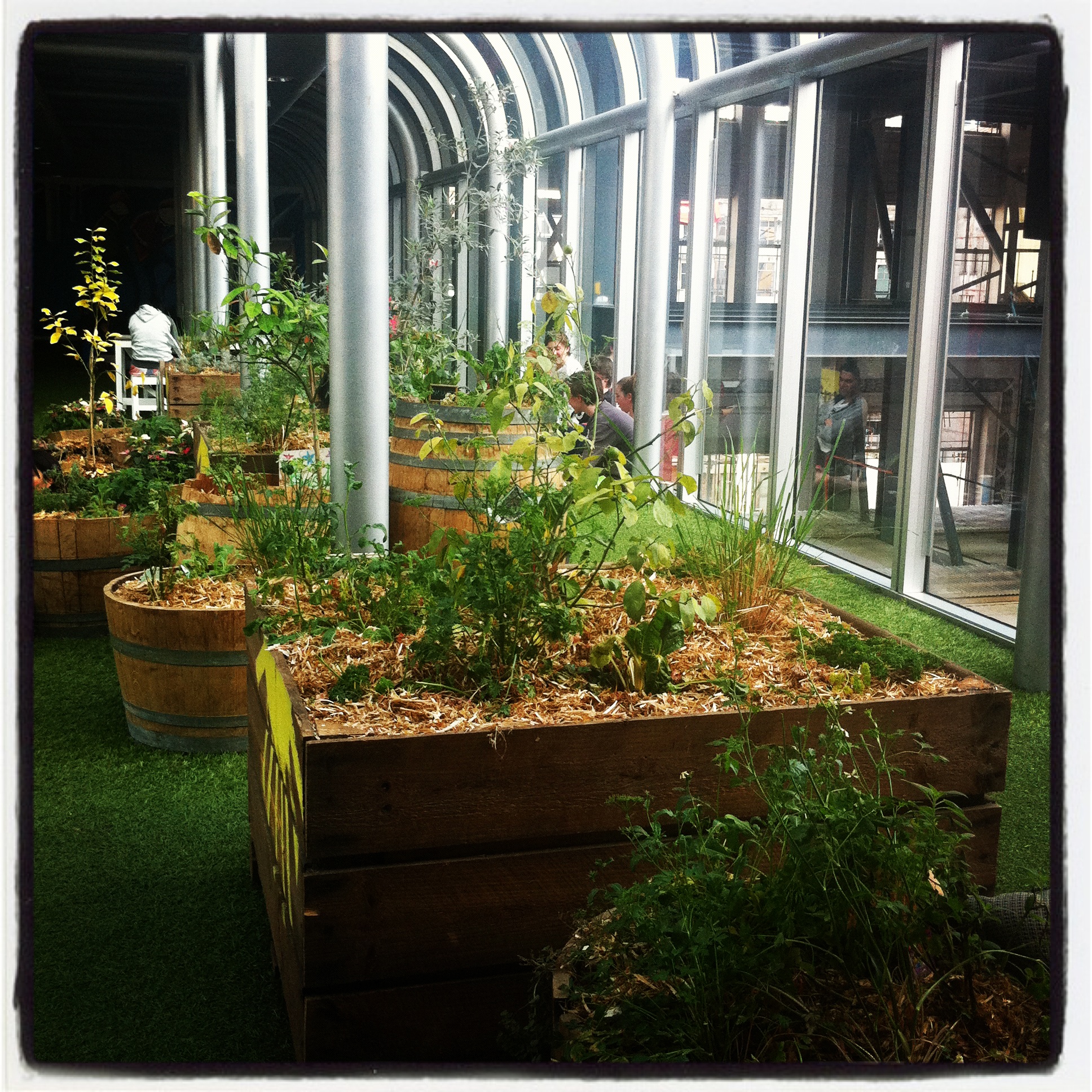 This photo was taken on the top floor of Melbourne Central shopping mall. It was taken at lunchtime on the same day and the floor was filled with people sitting on the floor, eating, talking. Despite being in the middle of a busy shopping mall, this is a community kitchen garden project.