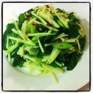 The apple and mint, with just a fleck of red chilli looks pretty, the smell as you tear the mint with your bare hands is amazingly fresh, the apple gives a pleasing crunch and as for the taste? This recipe has it all- that salty, sour taste from the tamarind, the hot spice from the chilli, the sweetness of the palm sugar. With the salad it lifts the whole traditional pork and apple sauce to a completely new level.