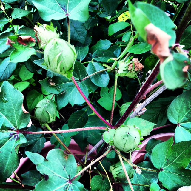The flowers have come out and in their place are the cotton fruits. They look like little pods and they’ll get bigger and bigger until they burst into little balls of cotton wool.