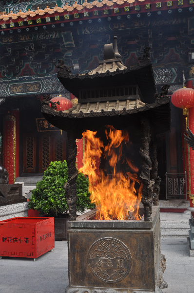 After bowing three times, the burning incense is then placed in the cauldron just outside the temple hall.