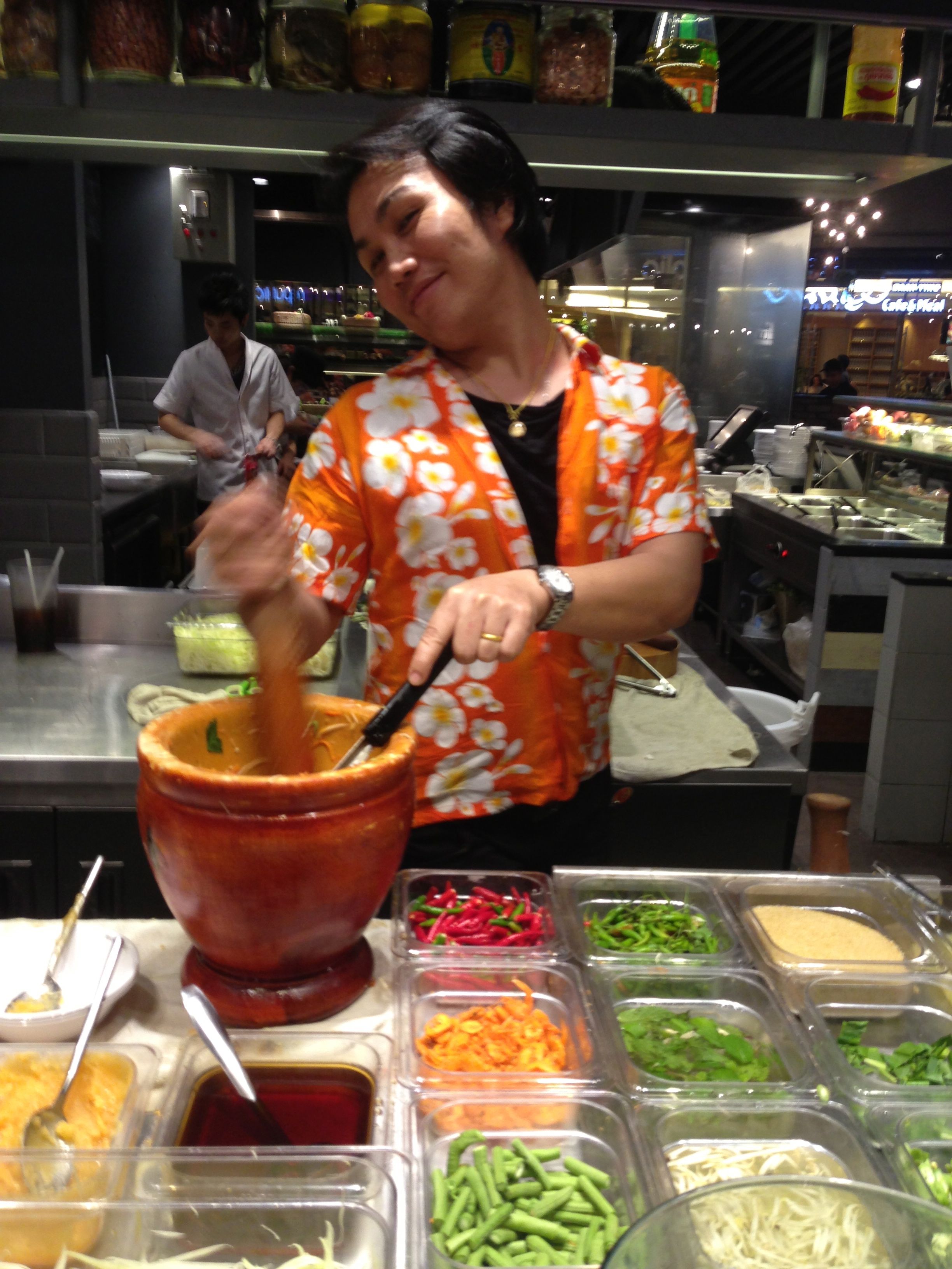 Hainanese chicken 85bht and papaya salad 70bht. The three of us were eating well for less than $10 aussie.