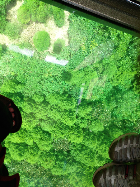 Beneath my feet, a long way beneath my feet, is the lush green of rainforest vegetation, the occasional farm, and, in some sections, what I assume is tea.