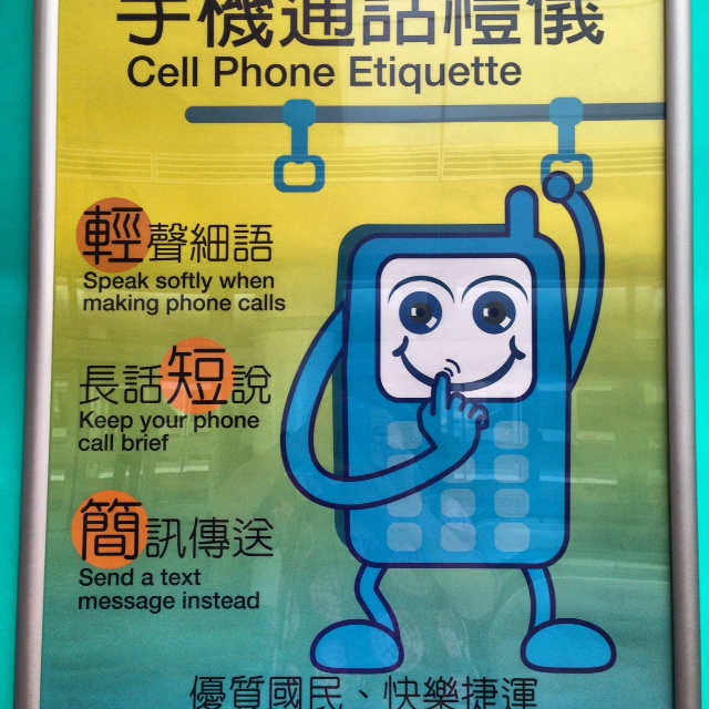 There’s signs everywhere telling you what you’re not allowed to do (no eating, no drinking, no spitting, no chewing gum, no chewing betel nut) and there’s signs telling you how to do the things that you might want to do (cough or take a phone call).
