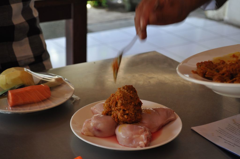 A general rule of thumb is that you need around 25g bumbu for each 100g of protein, but don’t get too hung up on that. When we made the chicken curry, Nyoman (our teacher) just dolloped on a spoonful that looked to be the same size as one of the four chicken thighs already on the plate. Too easy.