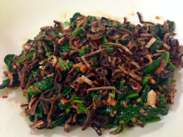 Hard as it may be to believe, but water spinach isn’t readily available at our local supermarket. Who would have thought it? Luckily normal spinach is a reasonable substitute. Anyways, here’s the recipe…It comes courtesy of Bali: The Food Of My Island Home, by Janet De Neefe.