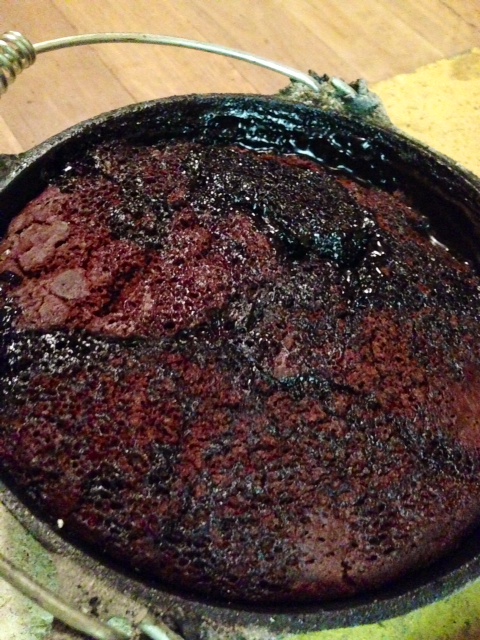 Also, I use a 2 quart (apparently in the camping world they still measure sizes by quarts) cast iron camp oven that I’ve “seasoned” over the fire as per instructions. As for the fire? I believe the official temperature of the coals was medium.