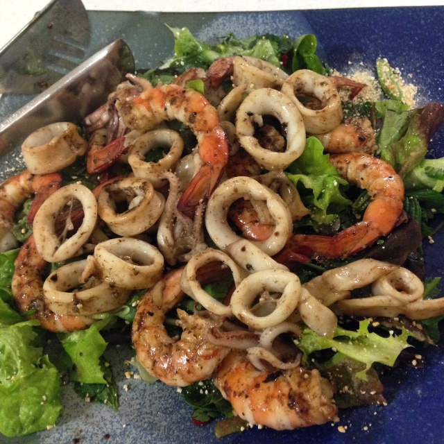 - Stir-fry the squid for a couple of minutes- that should be all it needs. Sprinkle with the cayenne, and then arrange into the salad.