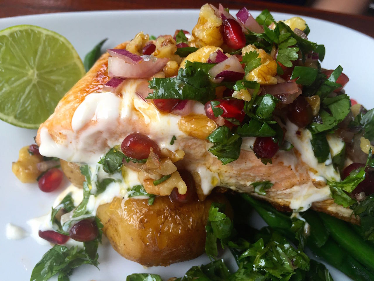 My friend had salmon with pomegranate, crispy chat potatoes, and green beans.