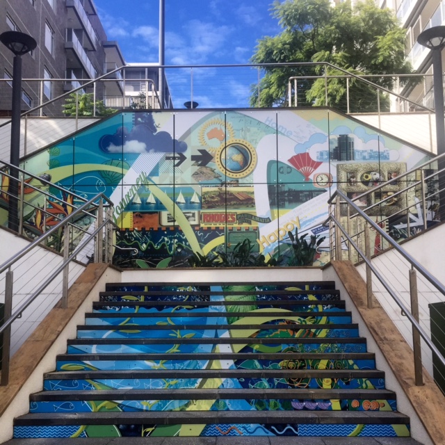 Canada Bay Council have prettied up the river walk I do most lunchtimes down at Homebush Bay. There are little statues, and a mural up the stairs (see main pic). It makes it all a little more interesting.