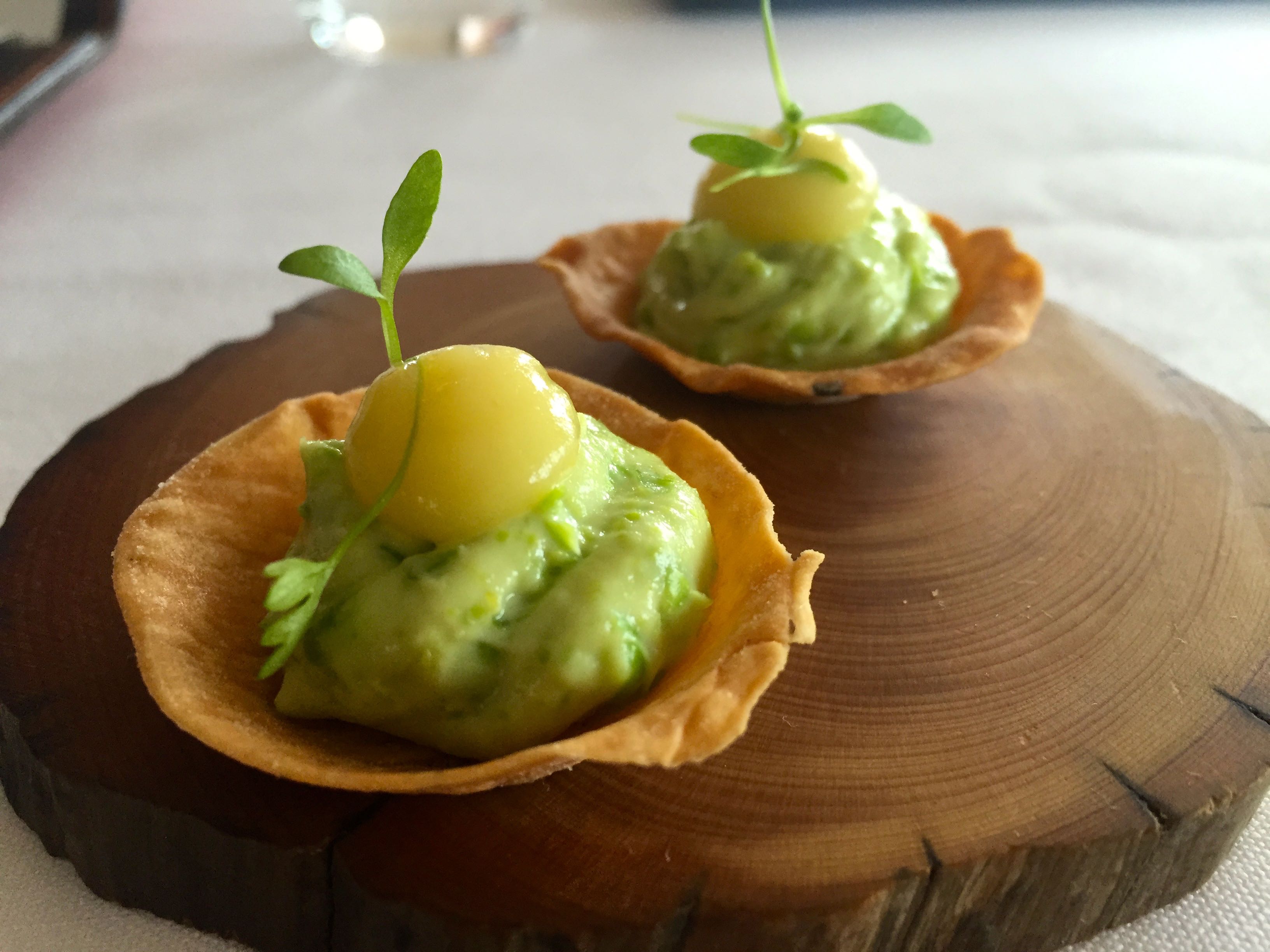Teeny tiny tartlets filled with pea and ricotta with a teeny tiny dollop of lemon curd on top.