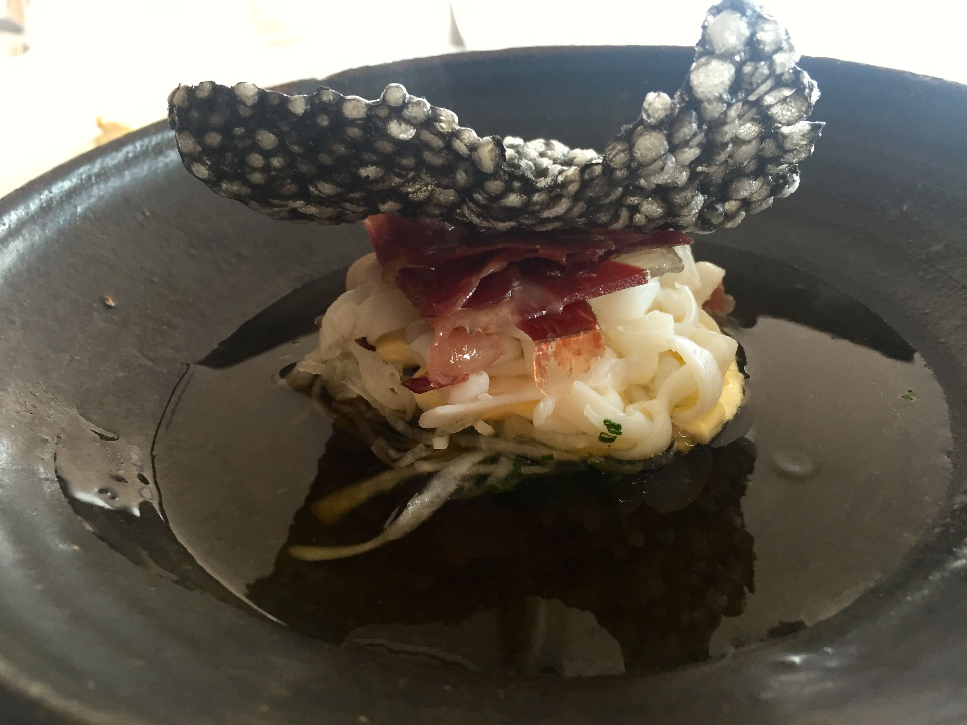I chose the calamari with Iberian jamon, dashi custard and shiitake mushroom tea. The weird octopussy thing on the top was a squid ink cracker. The calamari was sliced into tongue meltingly tender noodles. It was one of those dishes that made you want to take really small bites of- to make it last longer.