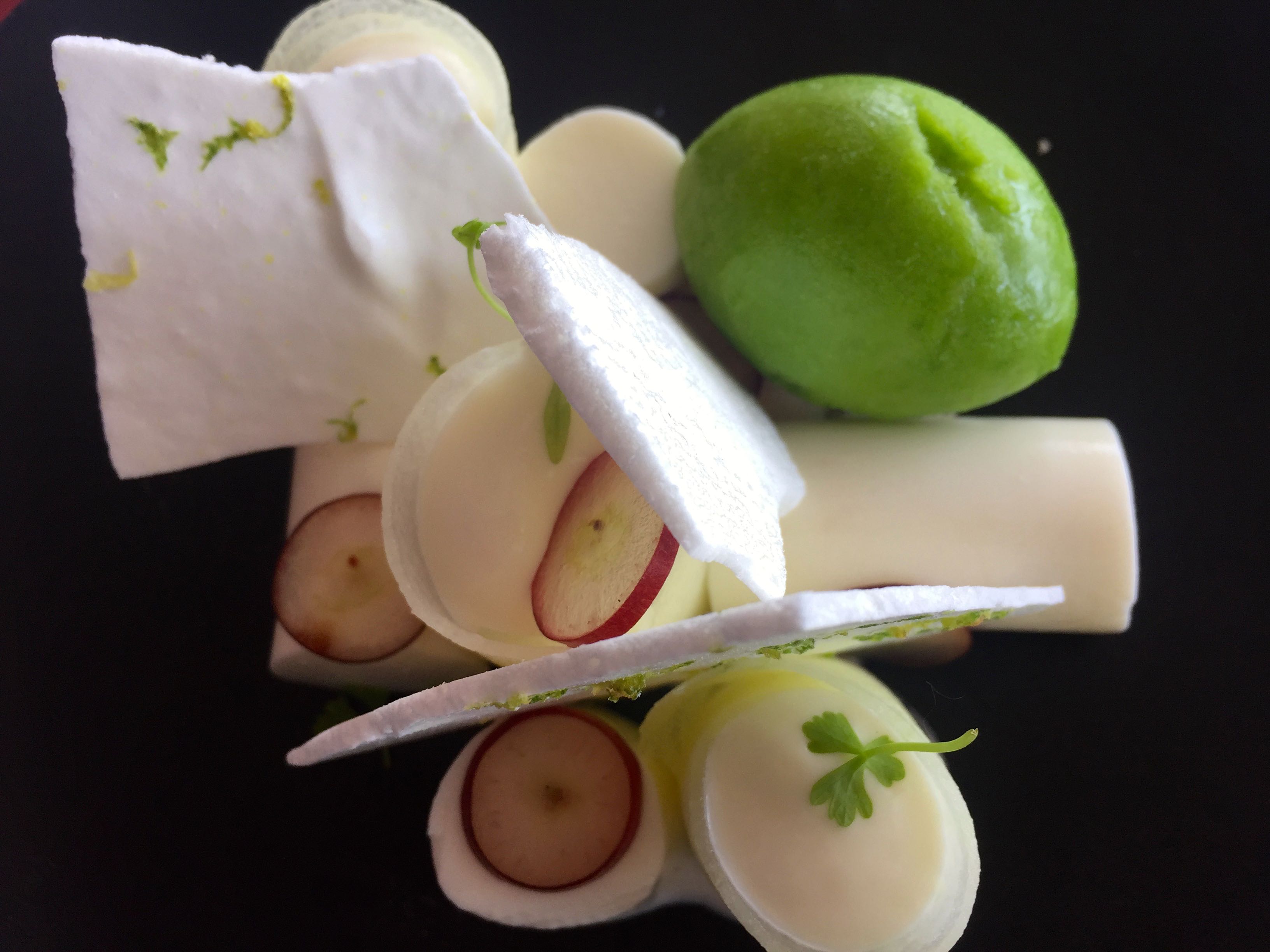 I had goat curd pannacotta with grapes, mint sorbet and melon. The melon was sliced so finely to form a little cylinder for the pannacotta. The shards were super-thin lime meringues.