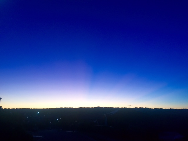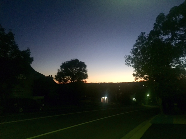 As I walk out the front door, it’s mostly dark, with a glimmer on the Eastern horizon.