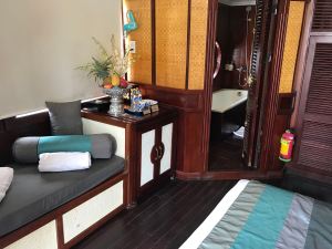 But not all Halong Bay cruises are alike. Looking at some of the boats around us, we’re extremely glad we chose this one. We’re even gladder (and yes, I’m aware that’s not a proper word) that our friend’s travel agent was able to snaffle the two terrace rooms at the front of the boat for us. They really are the best rooms cabins, on the vessel.