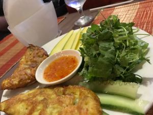 Bahn xeo, loosely translated, means sizzling cake – for the noise when the batter hits the fry pan. These pancakes, made from rice flour batter, are filled with prawn, pork, chicken, beansprouts, green banana, whatever. They are then wrapped in rice paper and dunked in dipping sauce. Some places will serve them as a communal pancakes, where you rip off a portion, wrap and dunk. We also made these at Red Bridge.