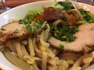 If you want to know more about that, here’s the link. Anyways, it’s topped with pork that’s been marinated, fried and then roasted; bean sprouts, puffy, porky little croutons of crackling, and grilled tice flour crackers.