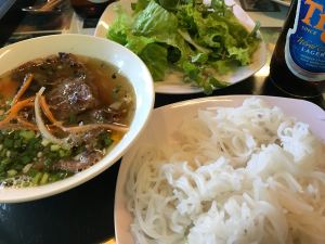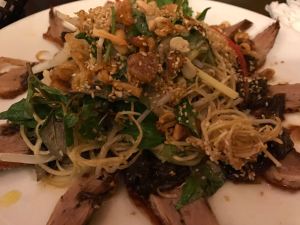 Oh my, this was good. Marinated beef is quickly stir-fried and served with fried onions on bun noodles (vermicelli), and lettuce. It’s served with peanuts, shallots, maybe some more herbs, and a sauce made simply from fish sauce, lemon and chilli. You stir it all together and add your own lemon and chilli to taste. Yum.