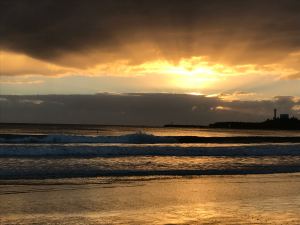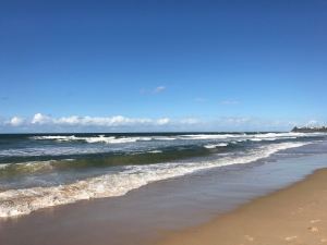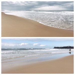 I also found out that activated charcoal is a thing, and that Dicky’s Beach in Caloundra was named for the wreck the SS Dicky that was beached here in 1895 (I think I got the date right). That’s Dicky’s Beach below. There was virtually no one on it yesterday – just a few surfers. On the horizon was a row of container ships heading down to Brisbane.