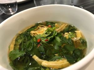 - Pork and prawn dumpling soup with shredded omelette and golden garlic