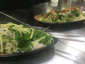 - Salad of caramelised pork belly with green papaya (green mango is out of season), and nahm jim dressing