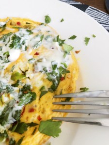 My recipe of the week though is this super easy, cheese-free spicy omelette. I’ve been attempting the 5:2 diet for the last couple of weeks and this is the perfect lunch on “fast” days. Again, it’s based on a Nigella recipe, but the recipe is more guideline than instruction.