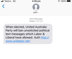 By far, though, the most annoying of all have been the texts from Clive Palmer’s UAP. Hilariously the last (unsolicited) text read as follows: