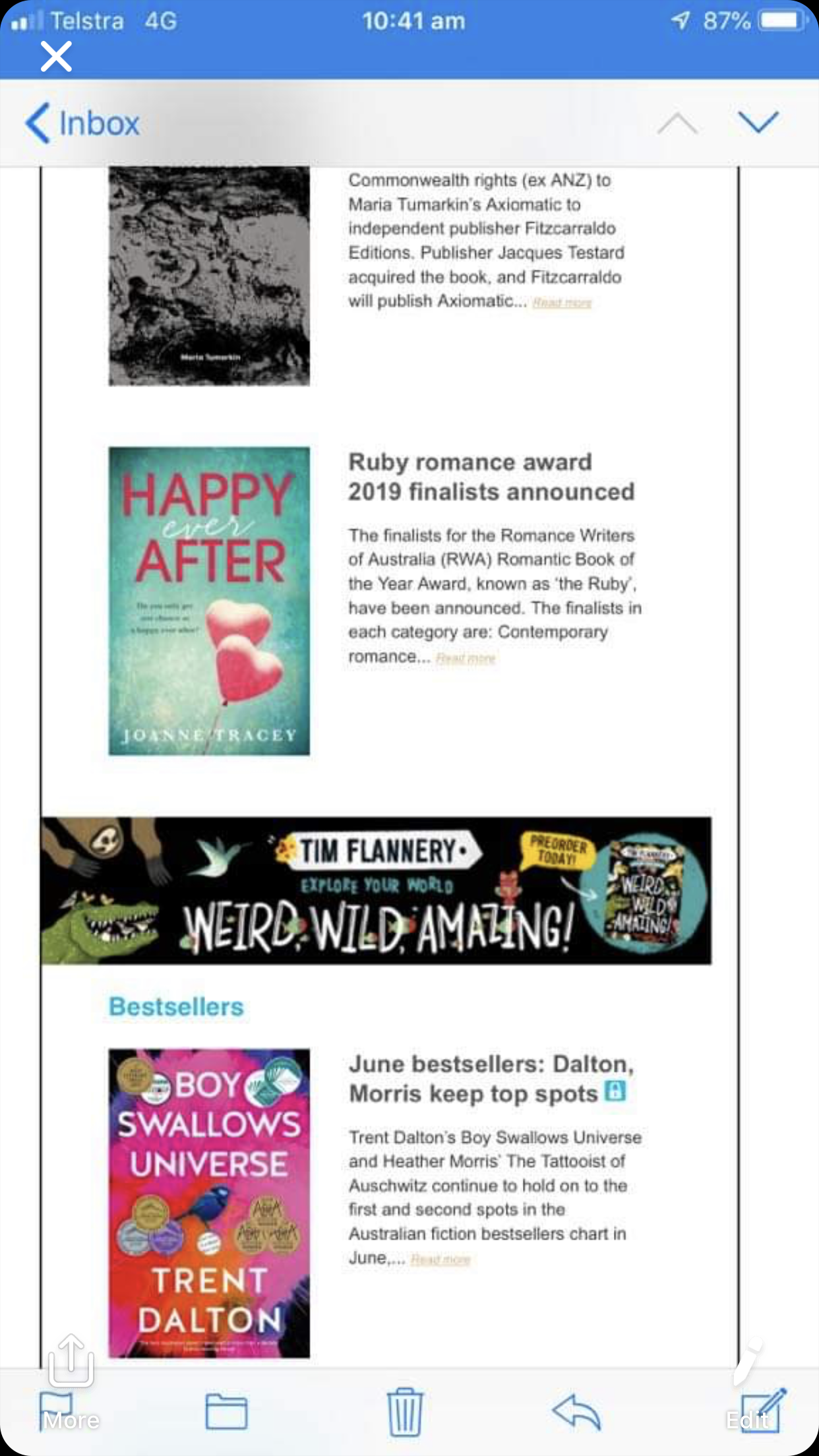 It was also a thrill to see my cover as the feature pic for the article about the RUBY announcements in the publishing trade newsletter…on the same page as Trent Dalton. There you go. Speaking of which, I still haven’t read that book…