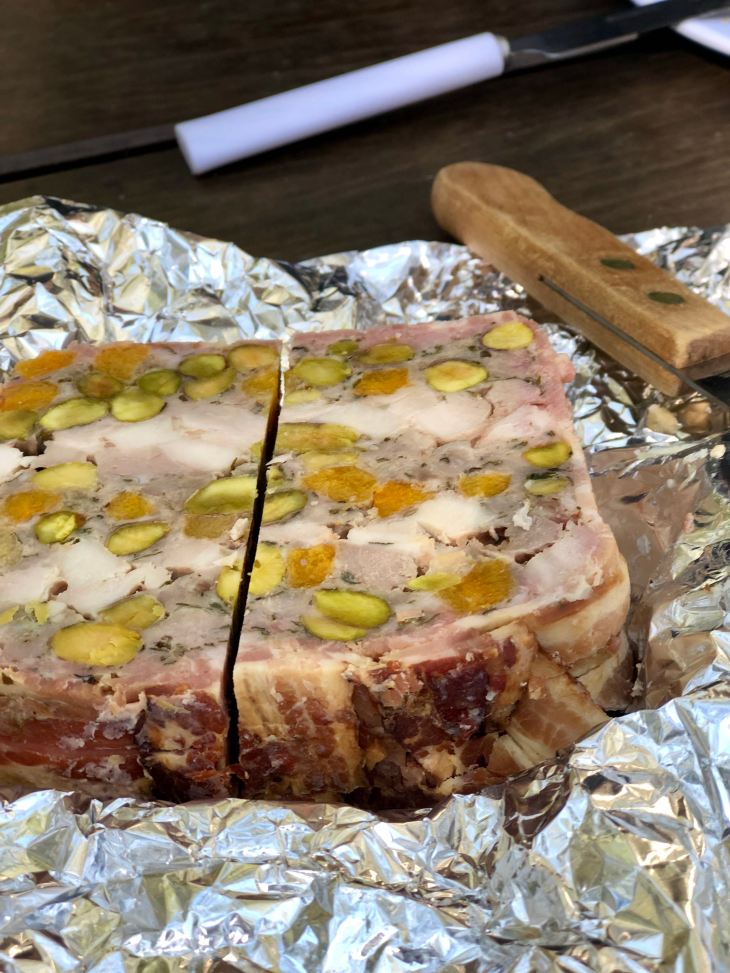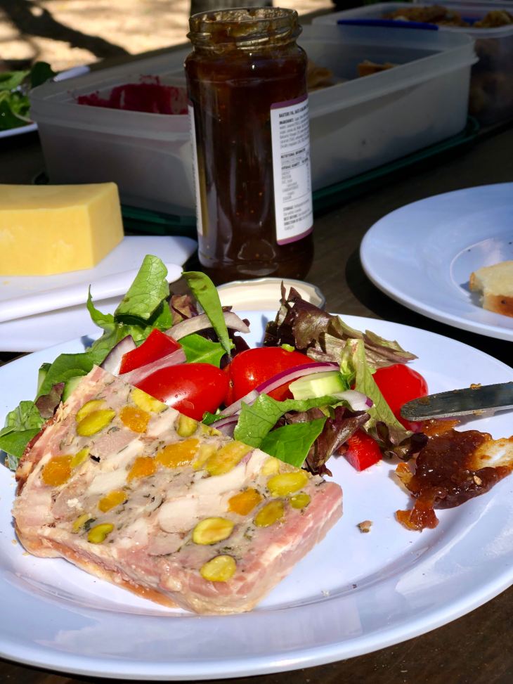 I also made a terrine – just how pretty does it look? Also in our esky was some local cheese that we bought at the markets yesterday, some oven baked chicken wings, the leftover dinner rolls and some salad and out we went.