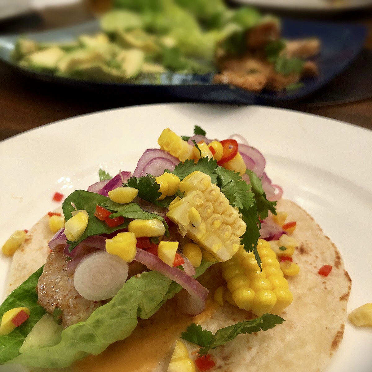 The tacos though, were seriously yum. We served them with a corn, chilli and coriander salsa, some lettuce and avocado, and a quick lime-pickled onion.
