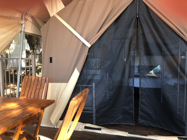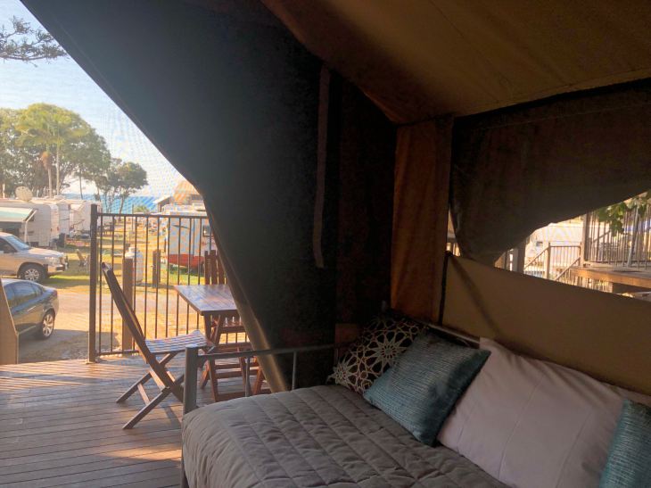 We stayed in a Treetops Safari Tent and with a queen-bed, ensuite bathroom, deck and some basic cooking facilities (a hotplate and a mini-barbecue) it was super comfortable – and we could see the ocean.