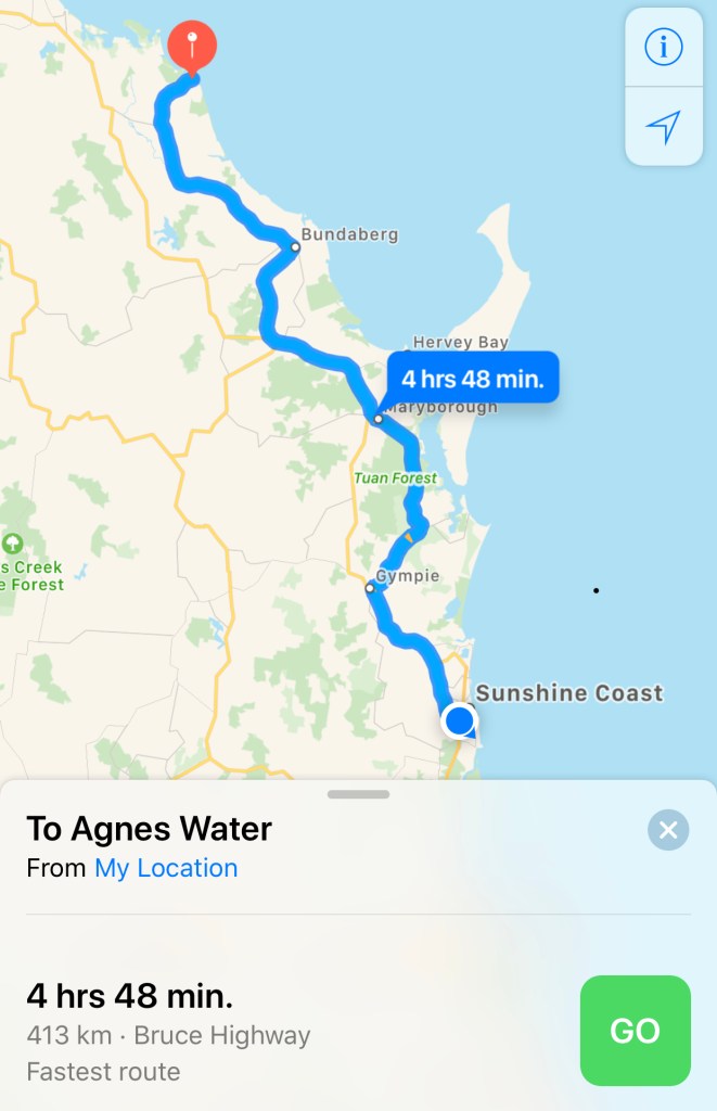 Agnes Water is located about 400 kms north of where we are on the Sunshine Coast, so approximately 5 hours north of Brisbane, 120km north of Bundaberg and 175km south of Gladstone. The town of 1770 is just a few kms north of Agnes Water.