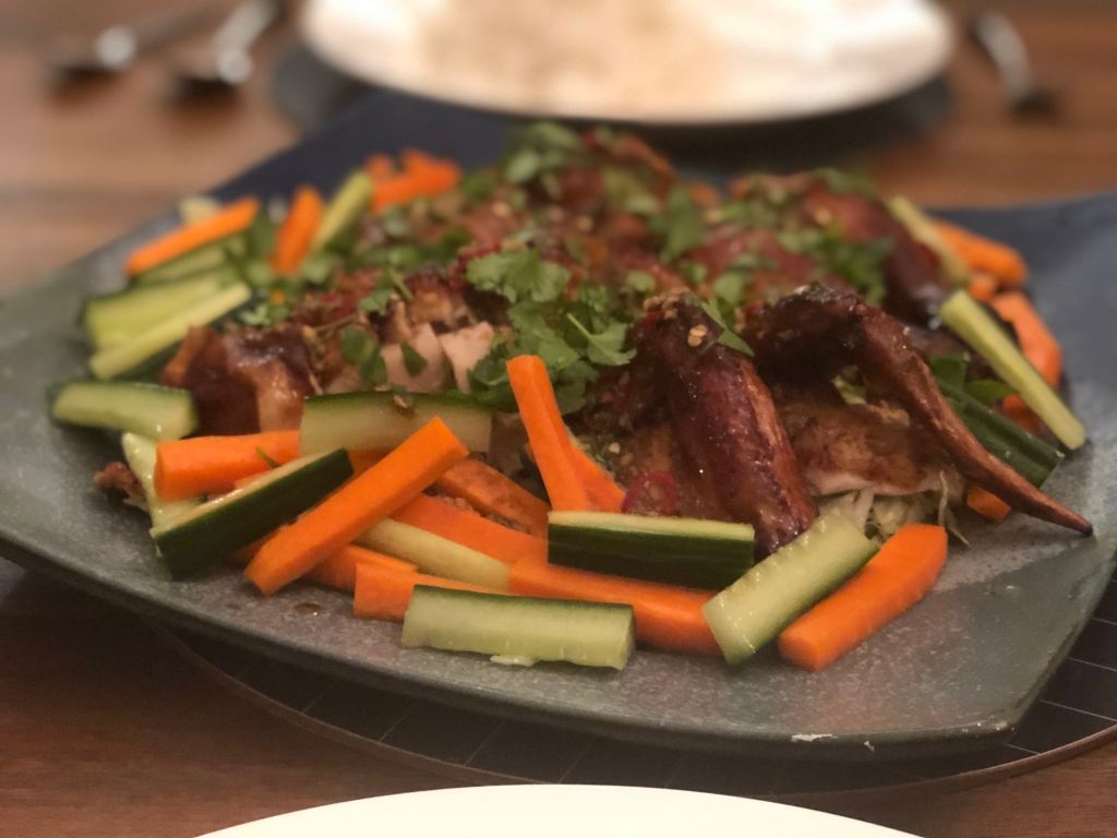 Shandong Chicken. This is one of our fave takeaway options, but we haven’t been able to get a decent one up here. This version is roasted not deep-fried which makes it cleaner and much healthier – but just as tasty…I think tastier. We served it with some pickled carrots and cucumber and steamed rice on the side.