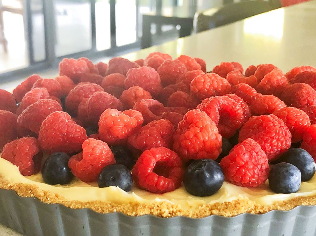 Dessert was unashamedly NOT Balinese. I’d normally do a black rice pudding but because I flew in that morning I took the quick and easy option with this lemony, fruity, cheesecakey tart. With just six ingredients (including both kinds of berries) and no baking involved, it’s a great I’ve run out of time dessert.
