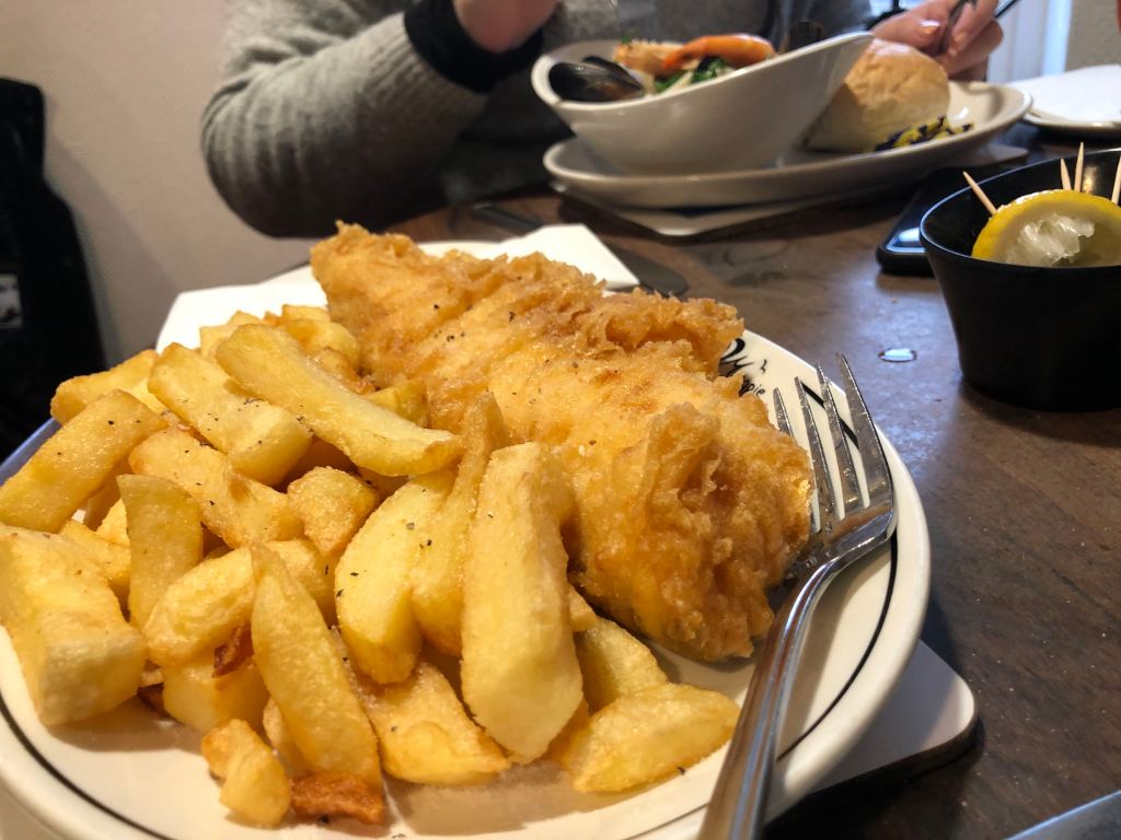 The menu offers 2 sizes: regular and large. The regular (Ā£10.95) comes with the warning, “This is Yorkshire – have this size and leave room for dessert.” No chance of that – the serving was huge and would have fed 2 of us. We saw the large come out and it seriously was the size of one of the boats that had gone to sea to catch the fish!