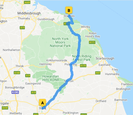 Staithes is 56 miles north east of York, so about 90 kms…as an aside, it does my head in having to work in miles in the UK #firstworldproblems