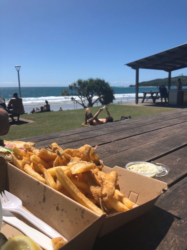 While our drive down to Canberra was long and rainy and we were dreading the tasks that lay ahead, coming back was a different story with an overnight stop in Coffs Harbour and a detour at lunchtime into Byron Bay for fish and chips on the beach.