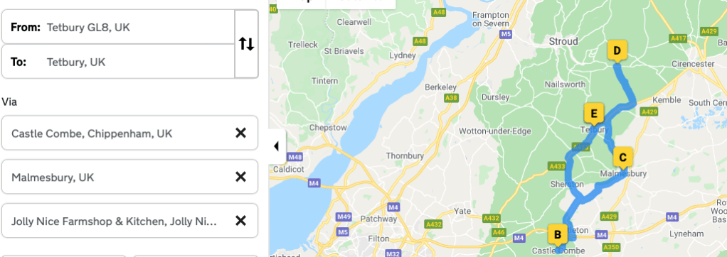 Malmesbury is located in Wiltshire, just 5 miles south-east of Tetbury. Castle Combe, also in Wiltshire, is 13 miles south of Tetbury, and Jolly Nice is located on the main road between Stroud and Cirencester at Frampton Mansell, just under 8 miles from where we were staying in Tetbury.