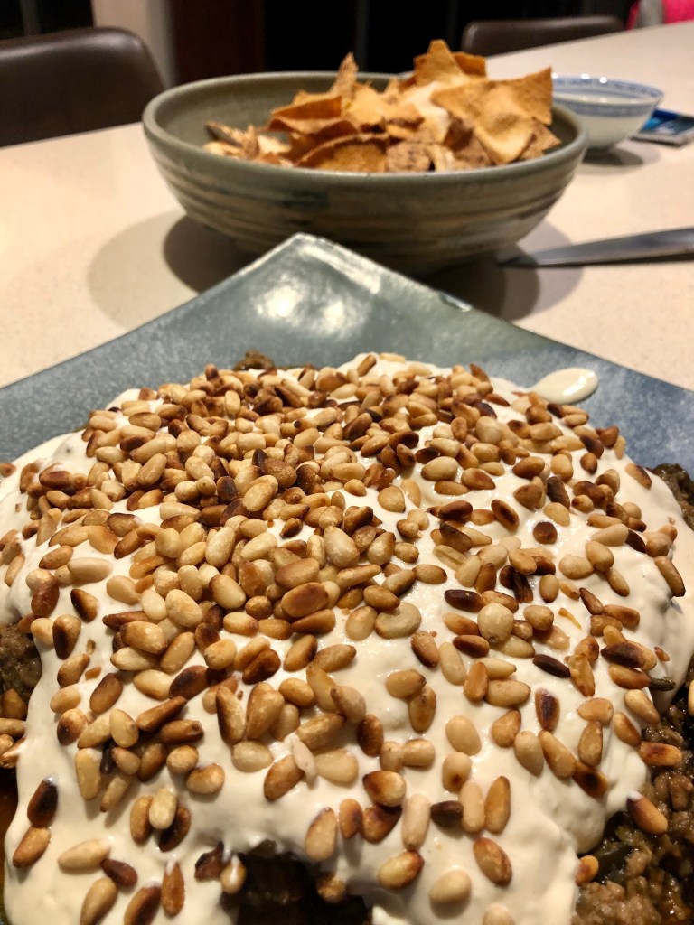 First up was Nigella’s Lamb and Aubergine Fatteh. Okay, the recipe (which you’ll find here) is for beef, but we used lamb mince. Sarah (in particular) was very “I don’t know how I feel about this” in relation to the aubergine and Grant, who also isn’t keen on eggplant (unless it’s Rice Boi’s version down at Mooloolaba Wharf – back in the days when we could eat out…aaah, the memories) would have said the same except they’d both not long received a lecture about opening their minds when it came to trying new things.