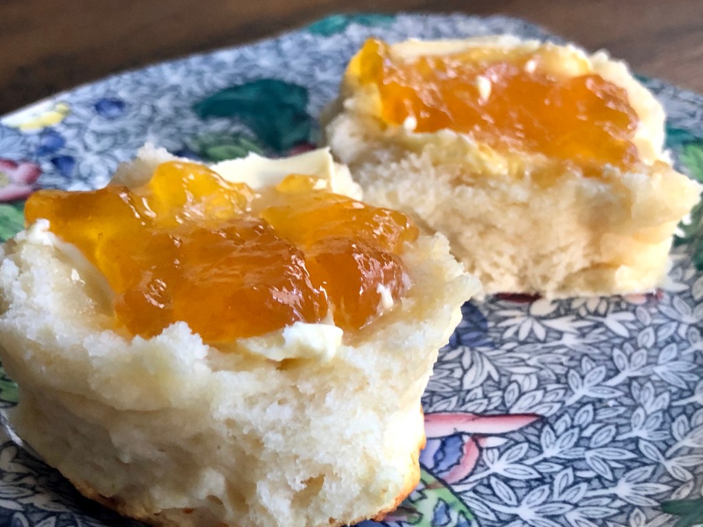These are best served with really good butter – we buy a French-style one from the Gympie Cheese Man at Kawana Farmer’s Markets – and marmalade or apricot jam. They’re also great with ginger jam – we get that from the Buderim Ginger Factory at Yandina.