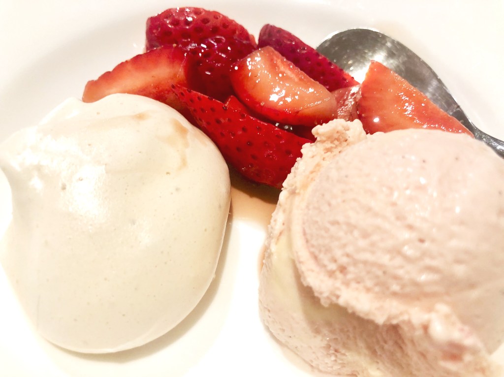 Anyways, the meringues. These are really no-nonsense to make and give a really smooth and glossy result. I served them with strawberry ice cream and strawberries macerated in cassis. James sandwiches his together with vanilla cream and serves them with strawberry sauce, so this is the recipe I’ll give you.